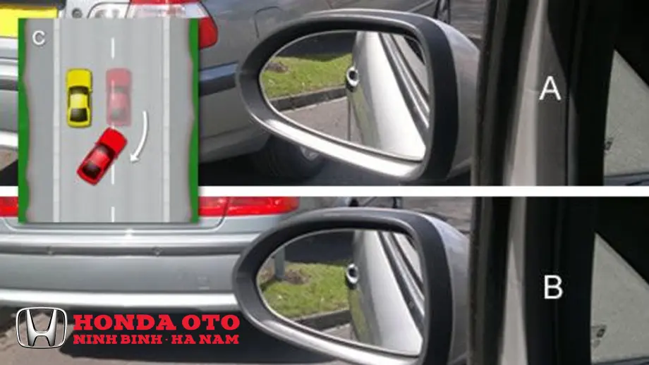 • Điểm căn: Gương chiếu hậu của xe bạn ngang bằng với gương chiếu hậu của xe A (hoặc đuôi xe bạn ngang bằng đuôi xe A).